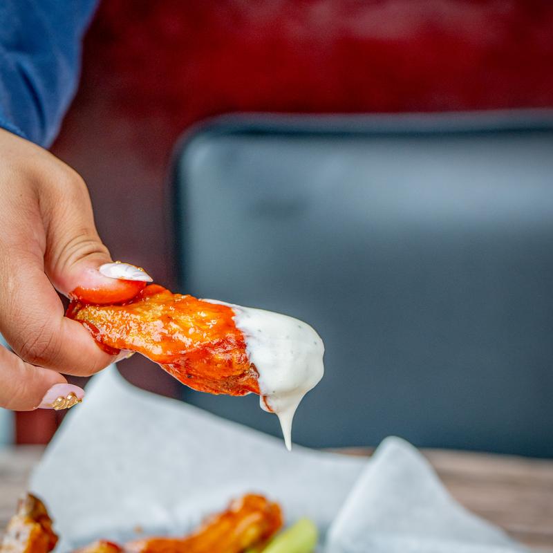 Yummy wings well prepared and they are really BIG wings too. I ordered 10 but took 1/2 home. Ate them the next day still good even cold! I have honey BBQ bone in wings with ranch dressing to dip. Yummy!